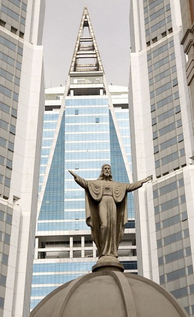 В Шанхае котолический храм.Рядом небоскребы.