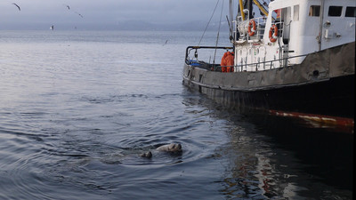 Mutter-Kind Robbe an Steuerbord: " Das sind die Fahrzeuge der Menschen, die uns das Futter wegfischen". Ganz phantastische, seltene Wildlife - Aufnahme. ich gratuliere !