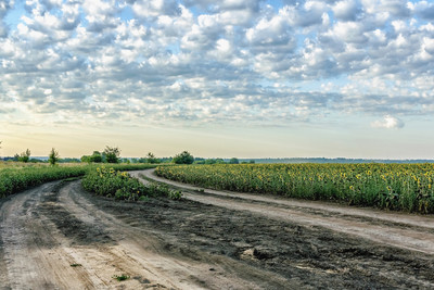 Когда приходит рассвет. По дороге к полю с подсолнухом ранним утром. За городом утром летним. И небосвод затянут облаками. Дорога мимо поля уходящая поворотом.. Сельский пейзаж.
