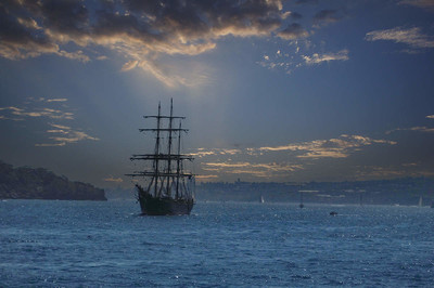 Spannend durch das Licht. Das Vollschiff verstärkt die Stimmung in der Bucht.
