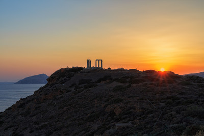 Провожая день Греция. Мыс Сунион. Храм Посейдона. Закат. Храм Посейдона был построен в 440 году до н.э. на месте предыдущего храма, разрушенного персами 480 году до н.э. Храм Посейдона был полностью сделан из мрамора, внутри, в главном зале находилась огромная статуя морского бога Посейдона. Храм был очень величественным и красивым, имел 42 дорийские колонны, только 16 из них сохранились до нынешнего времени. |