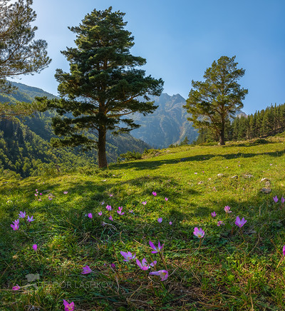 На лугах цветёт безвременник великолепный (лат. Cólchicum speciósum). В Красной Книги России.