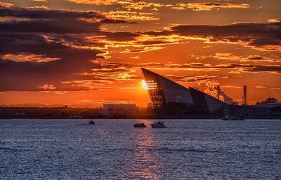 Die Sonne wie eine Galionsfigur am Bug eines Schiffes. Die Architektur macht neugierig.