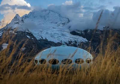 Гостиница «Футуро» на фоне гор Творение финского архитектора Матти Сууронена (Matti Suuronen) 1968 года. Была установлена в 1969 году на склоне горы Мусса-Ачитара в Домбае. Из фотопроекта «Кавказ без границ». |