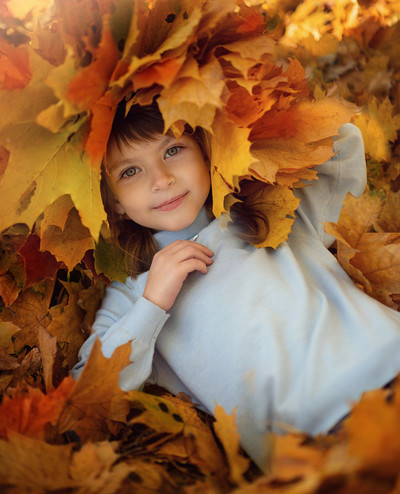 Какая прелесть! Осенние листья подчёркивают радость девочки!