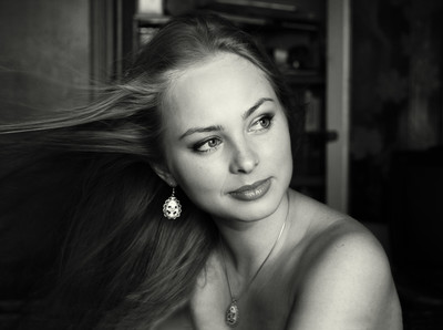 горизонтальная прядь? впечатление странное: в отсутствие ветра (снято в помещении) модель либо зацепилась волосами за что-то, либо кто-то ее за них тянет.