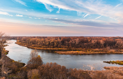 На реке закат осенний.