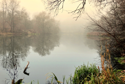 Густой осенний туман плывёт по реке