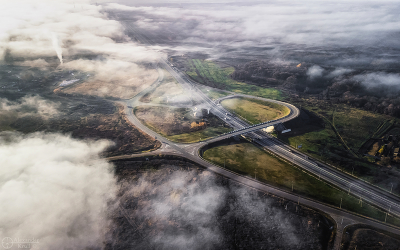 Дронофото. Окрестности Краснодара, начало ноября, федеральная трасса М-4 «Дон» туманным утром.