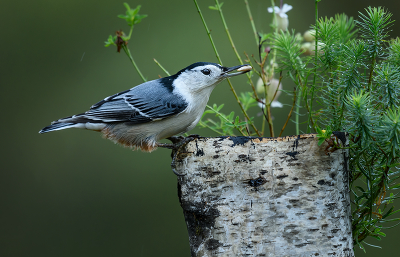 White-breasted Nuthatch Каролинский поползень (лат. Sitta carolinensis) — небольшая североамериканская певчая птица из семейства поползневых. В поисках корма ловко передвигается по стволам и ветвям деревьев. ======== The white-breasted nuthatch is a small songbird of the nuthatch family common across much of temperate North America. It is stocky, with a large head, short tail, powerful bill, and strong feet. It has a black cap, white face, chest, and flanks, blue-gray upperparts, and a chestnut lower belly |