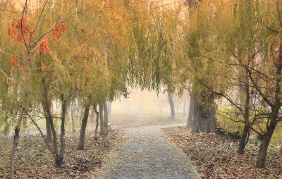 Сегодня шел по улице ,обратил внимание на плакучую иву ,мне кажется она осенью дольше всех держится в своей осенней красе ,медленно так меняет свои уходящие наряды.Она голубушка не только с туманом и с первым снегом будет заигрывать.)