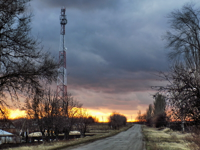 Начало декабря, дорога,вышка,затянутое тучей небо, горящий горизонт