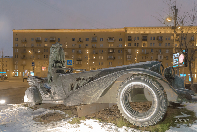Надо же как машину изобразили: аж перья на крылья примостили. Интересный памятник литературному герою)))