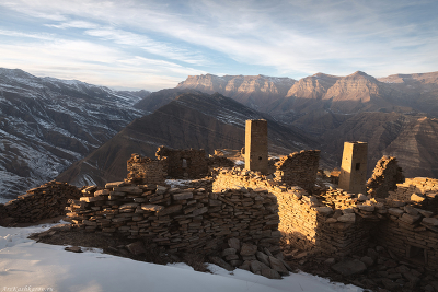 "Старый Гоор" Старинное селение Гоор - один из символов горного Дагестана. Село представляет собой оборонительный комплекс из боевых башен и примыкающих к ним жилых домов. Гоор находится на самом гребне скалы над пропастью и когда-то был действительно неприступным местом. Раньше башен было 7, но на сегодняшний день сохранились лишь 3. Самая большая достигала высоты 25 метров. По официальной информации башни построены в XIV-XVII веках. Однако, на многих камнях в кладке можно разглядеть языческие петроглифы, что говорит о гораздо более древней истории села и сооружений. В середине XX века люди покинули Старый Гоор, основав новое поселение ниже по склону. Сейчас большинство построек превратились в руины |