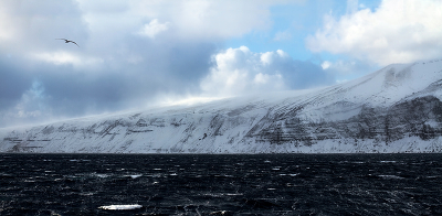Панорама из 3-х кадров. Наше судно встало в укрытие за этой скалой, где-то в Тихом океане. Ветер более 50 м/с.