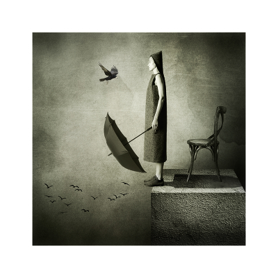 Зонта в руках девушки не должно быть совсем! Она просто стоит... в кадре не должно быть птиц, не вверху ни внизу... Девушка, стул и тень от неё и всё..