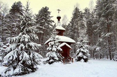 Часовня в зимнем заснеженном лесу