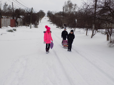 Улица в снегу, школьники