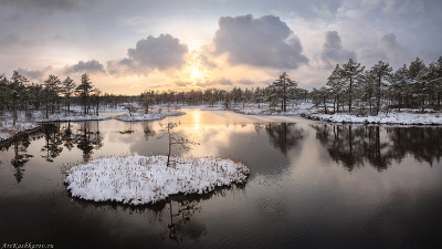 "Первый снег на болоте" Когда на болото приходит зима, небольшие озерки практически сразу покрываются льдом. Поймать состояние, когда всё уже в снегу, а озера при этом остаются незамерзшими, удается крайне редко. Мне повезло |