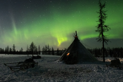 Аврора Русский Север. Полярный круг. Стойбище ненцев-оленеводов. Чтобы увидеть северное сияние (Aurora Borealis) необходимо совпадение трёх факторов: сильные магнитные бури, ясная морозная ночь и желательно находиться вдали от ярких источников света. В эту ночь нам повезло. Долгосрочные прогнозы погоды и уровня магнитных бурь оправдались. К 12 часам ночи температура упала до -38 градусов. Оленеводы сказали, что Аврора всегда приходит с севера. Мы расставили фотоаппараты на штативах и стали ждать. Через некоторое время над горизонтом появилась небольшая бледно-зелёная линза. Она переливалась и меняла форму, приближаясь к нам. Наконец представление началось. Хозяйка нашего чума Антонина, посмотрев на то, чем мы так восхищались, сказала: «Разве это северное сияние? Северное сияние – это когда светло, как днём, и небо переливается разными цветами. Я пошла спать». |