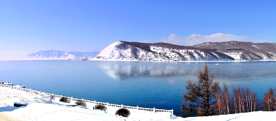 Alex-55-boy Пейзажная панорама истока Ангары Слева видна кромка льда Байкала, В центре, на противоположном берегу, порт Байкал, ближе к правому краю, на Ангаре виден заснеженный Шаман-камень
