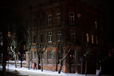 Старый дом в свете фонаря.