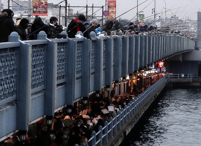 Рыбаки на мосту через Босфор, внизу рыбный ресторан