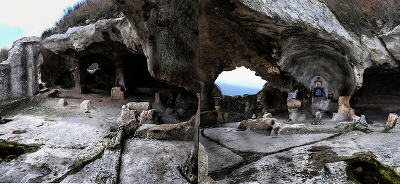 Иконы на руинах Эски-Кермен Крым Сохранившиеся остатки пещерных жилищ древнего города основанного в VI веке н.э. Верхние сооружения и крепостные стены не сохранились. У вырубленных в скале помещений разрушились потолки от эрозии и времени. |