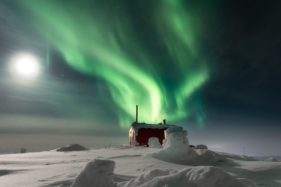 Полярное сияние в свете полной Луны над Волосяной сопкой