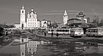 Две площади Здесь смыкаются нижняя часть города с историческим центром Арзамаса. Вид на Благовещенскую церковь, восстанавливаемый Спасо-Преображенский монастырь (справа) и площадь пассажирской автостанции. |