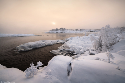 Иногда зимний пейзаж на фотографии выглядит удивительно нежным. А в действительности, мороз 30 градусов и ледяной туман, наползающий с открытой воды