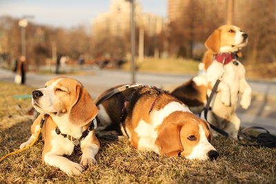 В городе уже весна. Люди выходят для прогулки в парки и на улицы. Эта милая компания биглей тоже решила погулять и погреться на солнце в парке.