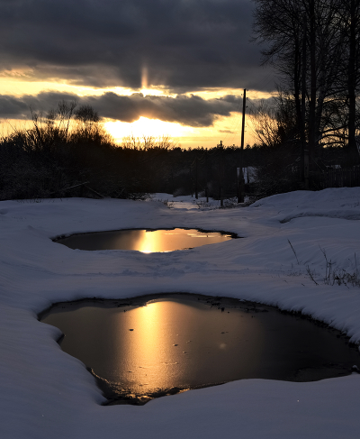 В лужах снег апрельский. Удалось быстро поймать момент интересного матового света в воде от заходящего солнца.
