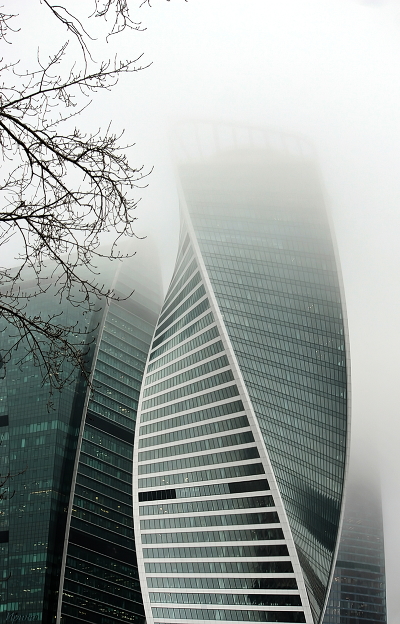 Без названия Москва-Сити...туман..Башня «Эволюция»..Каждый из верхнего 51 этажа самой башни повёрнут относительно предыдущего на 3 градуса, таким образом здание «закручено» более чем на 156 градусов. При этом центральное ядро и восемь колонн с 15-метровыми пролётами между осями остаются строго вертикальны всю высоту. |