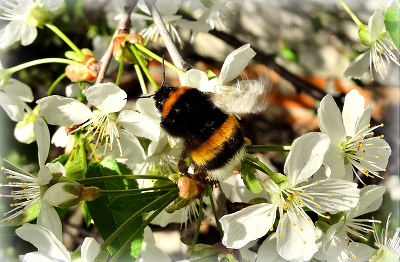 Мирный шмель, в мае, трудясь добывает нектар, машет крылышками, собираясь перелететь на другой цветок