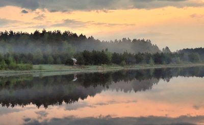 , Это по всему берегу рыбацкие и туристические домики и беседки! Тихо к вечеру стало и всё отразилось в воде вместе с туманом!