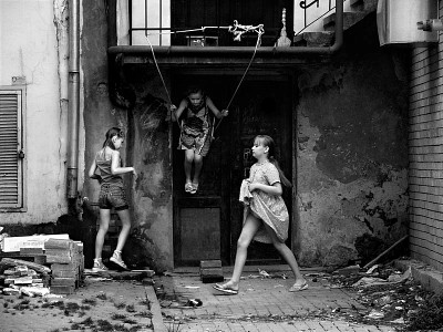 с этой девочкой будет трагедия, ее через секунду сшибет девочка на качелях, при чем ни та ни другая друг друга не видят .... вообще три девочки не догадываются о существовании друг друга ... Смущает еще это место, под ступней плотная тень, контрастная, а под самой девочкой нет и намека хотя бы на размытое пятно тени ... Ирреально смотрится картинка ... Не знаю, но что-то внутри не принимает увиденную ситуацию ...