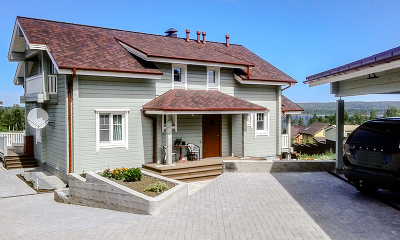 Дом на склоне горы Деревянный дом был спроектирован и построен по комбинированной технологии: первый этаж которого был выполнен из клееного бруса, а второй по каркасной технологии. Отделка фасадов на фото говорит о качестве подгонке блокхауза верхней части здания к нижнему первому этажу из клееного бруса. |