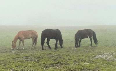 Кони на выпасе в тумане