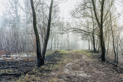 Весна, утро, туман.. В лесу туман, утром весенним. Когда утром туманно, по дороге в лес. Вдали туман опустился, в лесу.. Дорога лесная ближний план, промеж деревьев, обгоревших в прошлогоднем пожаре.. Зеленеет растительность, трава и приходит весна. В тумане природа утром весенним. |