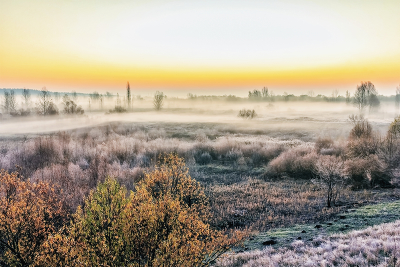 Скоро рассвет.. Осень, туман стелящийся немного вдали.. Спуск к водоему природному.. На ближнем плане кусты в осенней листве. Немного заморозки на почве. Осенним утром туманным. Когда приходит рассвет осенним утром.. |