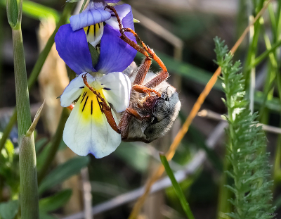 Майский жук, или Хрущ (Melolontha) на фиалке трёхцветной (Víola trícolor)