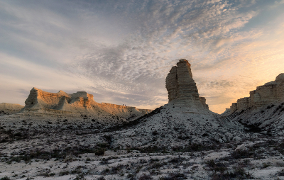 Аккергешен на рассвете Казахстан. Мангистау. Аккергешен на рассвете. После бессонной ночи, проведённой за съёмками Млечного Пути, было интересно наблюдать, как Солнце нежно прикасалось первыми лучами к меловым останцам... |