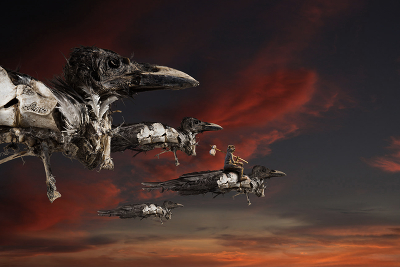 тушки воронов, тут совершенно одинаковы,отличаются только размером, что меня ( повторюсь: меня ) несколько напрягает, ну может и зря напрягает. Потом - они летят, но некоторые останки перьев ( или что там у них), как по мне, должны быть наклонены по ветру, чтобы акцентироваться на движении вперед.