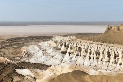 Сор Тузбаир Сор Тузбаир - величественное творение природных стихий. В этом месте чинк, то есть обрыв плато, круто обрывается каскадом глинистых известняковых меловых ступеней, в основании которых лежит обширный солончак. В этой местности даже воздух пропитан многовековой работой ветров, соли и воды. Отвесы меловых обрывов изрезаны многочисленными промоинами и глубокими руслами, образуя бесконечные ряды сказочных колонн. |