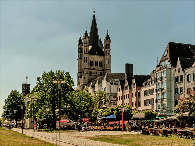 Köln Церковь Святого Мартина (Groß St. Martin) Церковь была построена в 1220 году как часть монастыря бенедиктинцев и за годы столь долгого существования неоднократно ремонтировалась и перестраивалась. В XIX веке в процессе секуляризации она была отобрана у бенедиктинцев и обращена в обычную приходскую церковь, но в 2009 году состоялась обратная передача в состав монашеского ордена. В результате бомбардировок английской авиации в 1942 году от нее остались лишь руины, но к 1965 году были отстроены башни, а спустя еще 20 лет Святой Мартин полностью открылся для прихожан. |