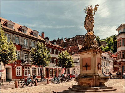 Корнмаркт со статуей Мадонны/Heidelberg, Germany/ Статуя Мадонны на Корнмаркте была возведена в ходе рекатолизации при курфюрсте Карле Филиппе. Созданная Петером фон ден Бранденом в 1718 году Мадонна на кукурузном рынке считается самой красивой статуей в стиле барокко в Гейдельберге. На западной стороне площади Корнмаркт стоит величественный Дворец принца Карла — с 1788 года гостиница, до 1915 года один из ведущих отелей Гейдельберга, сегодня место проведения мероприятий с великолепным Зеркальным залом, — а в дальнем восточном углу — бледно-желтый дом Французский граф де Граймберг. Шарль де Граймберг по собственной воле и огромными усилиями стал консерватором замка и основателем городских коллекций произведений искусства. Граймберг умер в 1864 году, дожив до своей мечты о сохранении замка. |