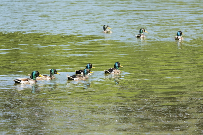 Утки сейчас с выводками, а селезни линяют и кучкуются сами по себе.