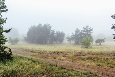 Утром летним в июне. За лесным массивом. Когда утром туманно.. Дороги за лесом на ближнем плане. Типа островка с деревьями в тумане. И дальше плотный туман..