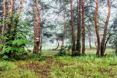 В лесу утром туманным.. В гостях у белочки. Там где кормушка для птиц и белок. Сосны в лесу. И вдали еще туман рассеивается. Летним утром в июне туман.